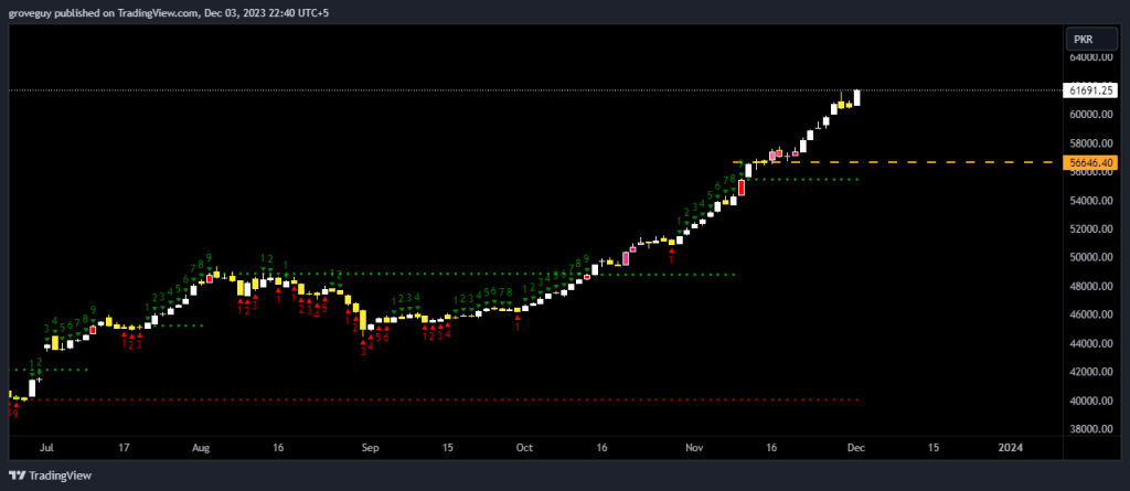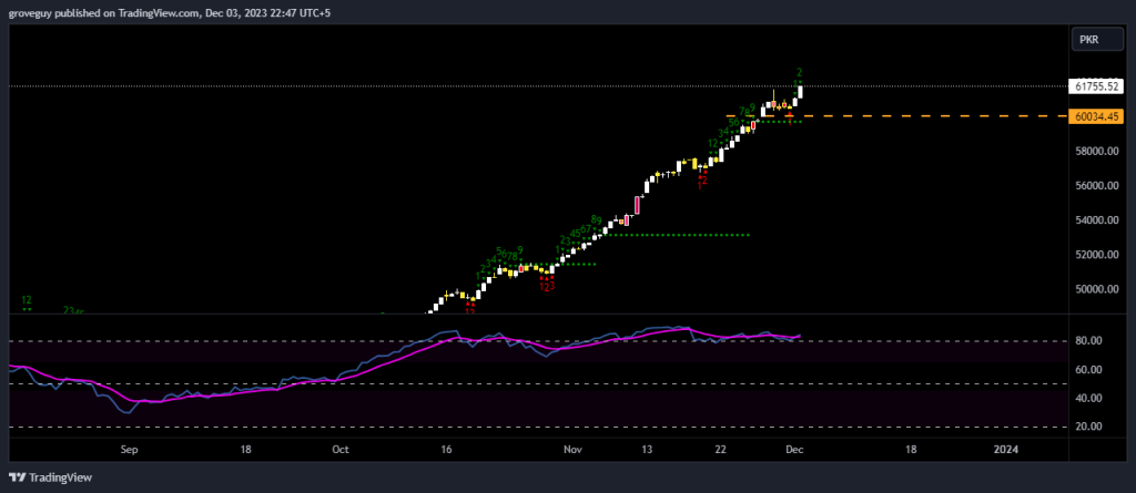 Weekly is far and away from the nearest sustainable support or structure, suggesting that there could be a pull back soon. Also sequential 9th weekly candle is indicating the same, nearest support on the weekly time frame is at 48730. To find more clues lets go to the smaller time frame.